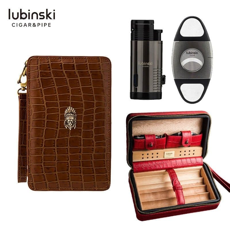 Bao da cao cấp Lubinski YJA-60007 là sự kết hợp hoàn hảo giữa tính thẩm mỹ và công năng. Được chế tác từ chất liệu da cao cấp mềm mại bên ngoài và gỗ tuyết tùng (Cedar) giữ ẩm bên trong, sản phẩm giúp bảo vệ hương vị xì gà trọn vẹn trong mọi chuyến đi. Điểm đặc biệt của set này là sự đồng bộ tuyệt đối với bật lửa khò và dao cắt đi kèm, tất cả gói gọn trong một thiết kế cầm tay tinh tế.