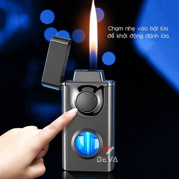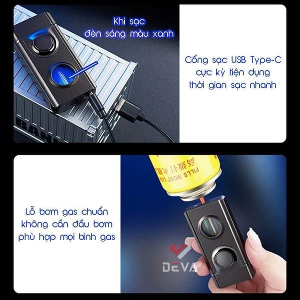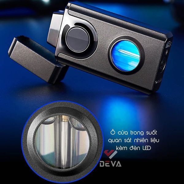 3. Thiết Kế Sạc Lại và Hiển Thị LED: Sử dụng gas Butane tiện lợi, nhưng được trang bị mạch điện tử sạc qua USB để cung cấp năng lượng cho hệ thống cảm ứng và đánh lửa. Cửa sổ trong suốt có đèn LED bên trong không chỉ tạo điểm nhấn thẩm mỹ mà còn giúp kiểm tra tình trạng nhiên liệu. Mẫu bật lửa này có thể được bơm đầy với hầu hết tất cả các loại bình gas có tại Deva Shop mà không cần sử dụng thêm bất kỳ đầu bơm nào.