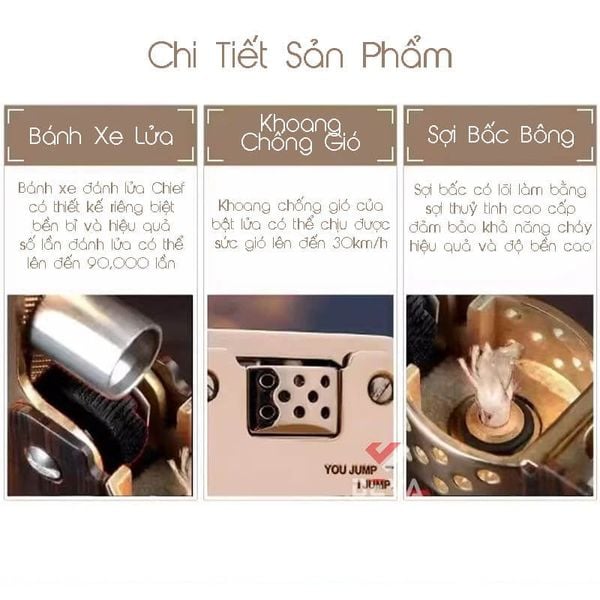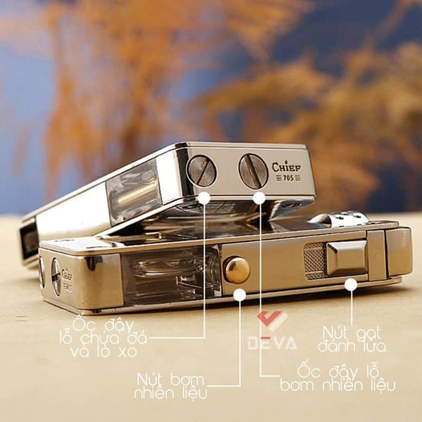 - Chief CF705 sử dụng chung xăng, đá và bấc (tim) của Zippo hoặc Zorro. Đây là các phụ kiện rất dễ tìm mua tại Deva hoặc bất kỳ cửa hàng bật lửa nào trên toàn quốc.