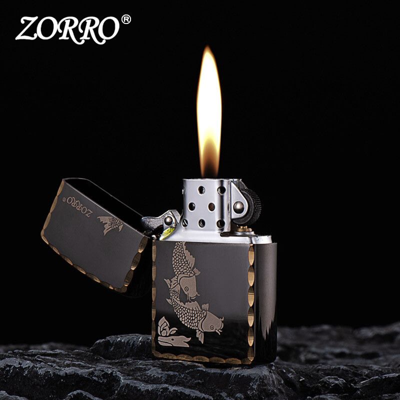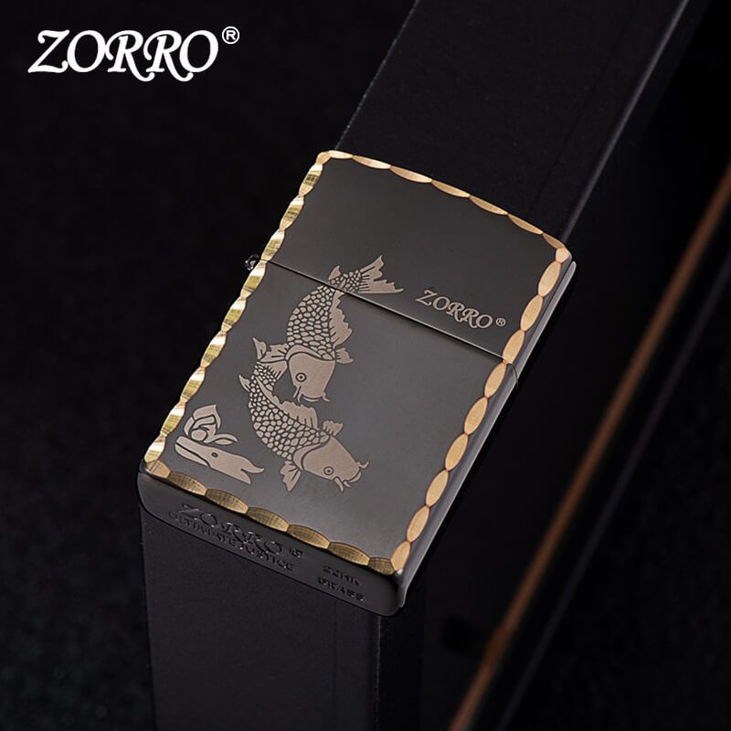Bật lửa xăng đá Zorro đen bóng viền gõ búa chủ đề cá chép Z91325A
