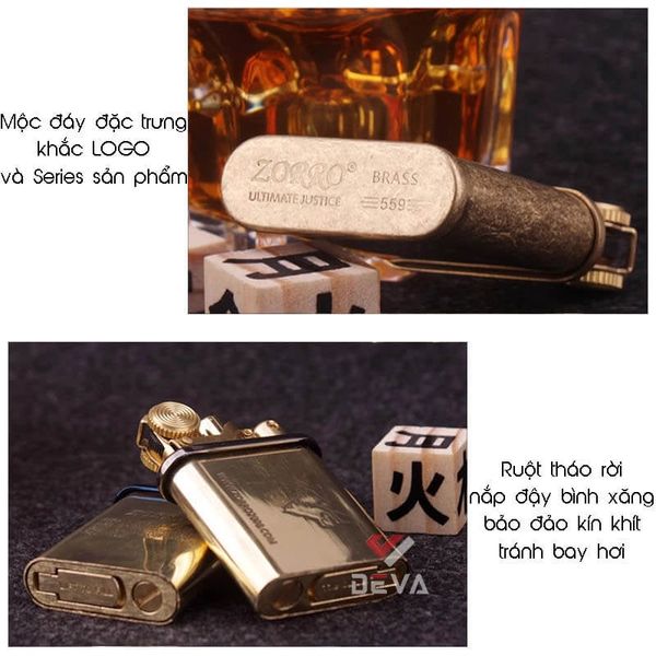 Bật lửa xăng đá chính hãng Zorro đồng nguyên khối có nắp chụp bấc Z559