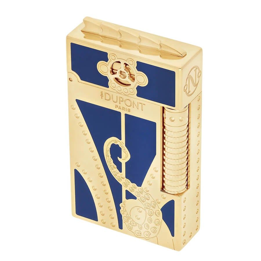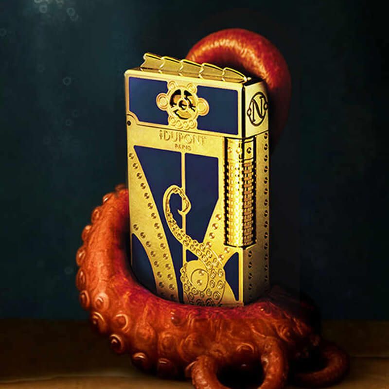Bộ set được hoàn thiện bằng laque Blue Gulf Stream đặc trưng, hòa quyện giữa sắc xanh biển sâu và họa tiết tenta mực khắc tinh xảo, cùng lớp hoàn thiện mạ vàng cao cấp. Trung tâm của bộ là bật lửa Le Grand Dupont với hệ thống đánh lửa đôi có thể tạo ngọn lửa vàng hoặc ngọn lửa xanh, mang đến trải nghiệm châm lửa vừa mạnh mẽ vừa tinh tế.