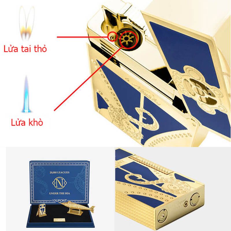 - Bộ sản phẩm bao gồm một chiếc bật lửa Ligne 2 thiết kế đặc biệt và một mô hình tàu ngầm Nautilus tinh xảo dài 250mm. Mô hình này không chỉ để trưng bày mà còn đóng vai trò như một giá đỡ nghệ thuật cho bật lửa.