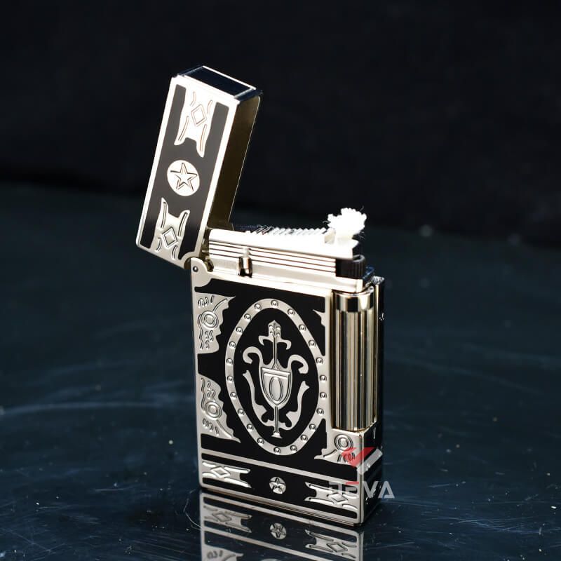 Bật Lửa ST Dupont Xăng Đá 1 Lỗ Sơn Mài Đen Hoa Văn Cổ Điển Châu Âu D08V-DX Viền Vàng: