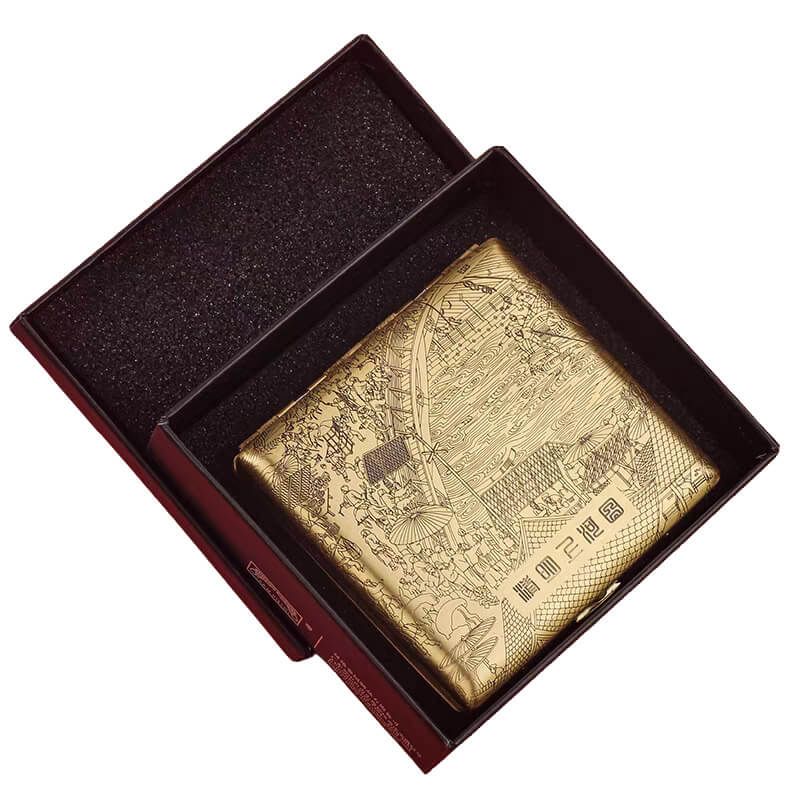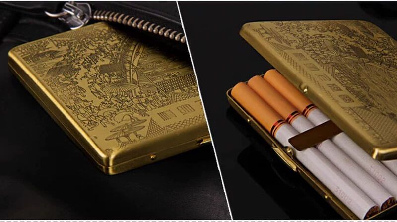Hộp thuốc lá kim loại: bền, chắc chắn, dễ lau chùi, phù hợp với người thường xuyên mang theo hoặc thích phong cách mạnh mẽ. Mẫu mã đa dạng: trơn, khắc hoa văn, khắc hình rồng – phượng, sọc dọc hoặc giả carbon.