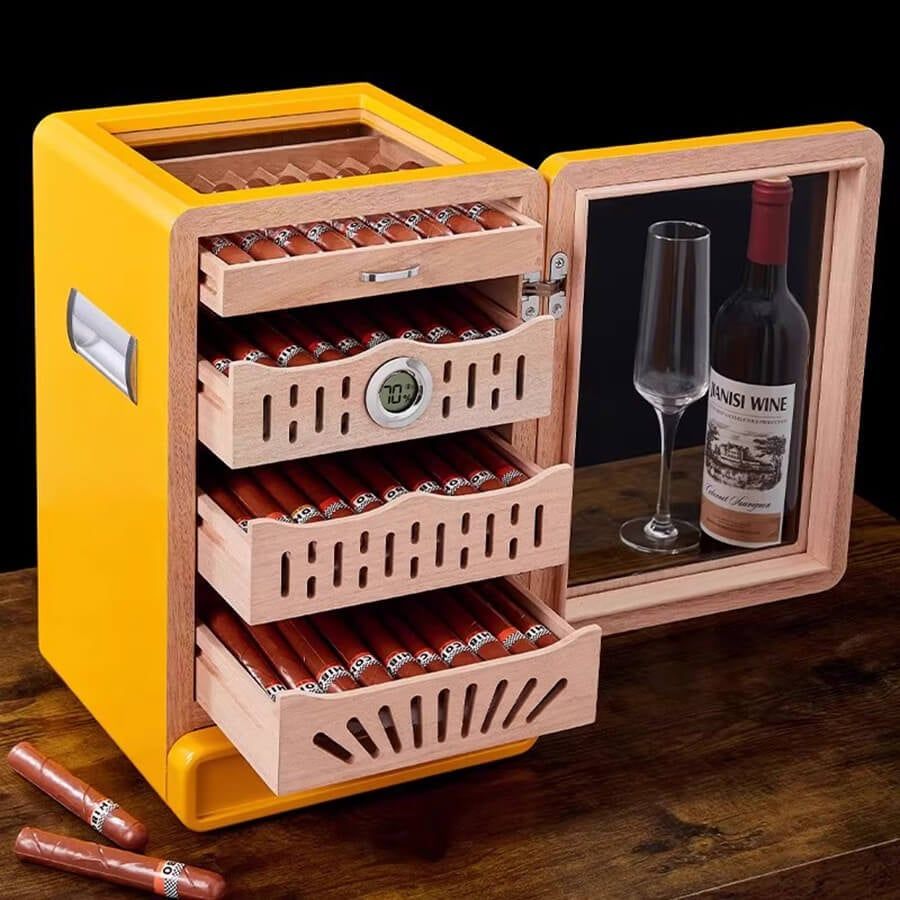 Hộp bảo quản cigar với vỏ gỗ tuyết tùng cao cấp, nắp kính trong suốt, đi kèm khay giữ ẩm bên trong — giữ độ ẩm ổn định, bảo toàn hương vị và tuổi thọ xì gà.