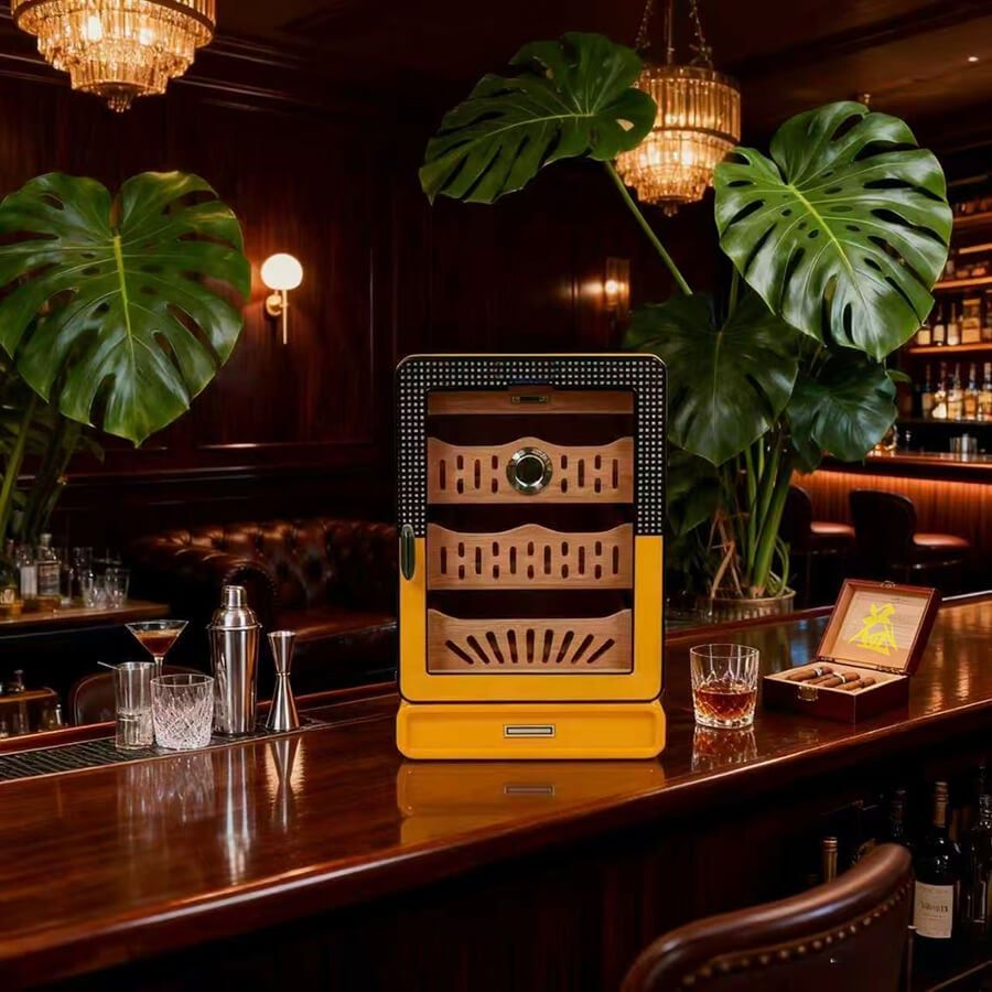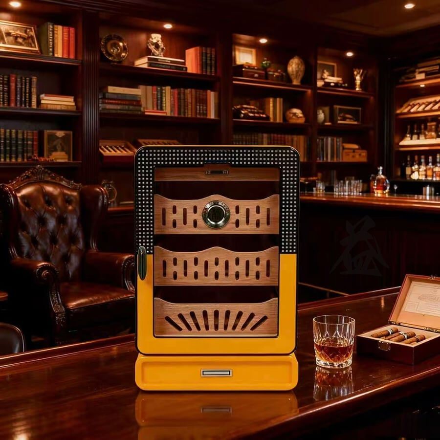 Hộp giữ ẩm xì gà gỗ tuyết tùng cao cấp có kính được thiết kế đặc biệt để bảo quản và giữ ẩm cho cigar — giúp điếu luôn giữ được độ ẩm lý tưởng, bảo toàn hương thơm và kéo dài tuổi thọ của xì gà. Gỗ tuyết tùng bên trong có tác dụng hấp thụ và phân tán độ ẩm đều, kết hợp cùng khay giữ ẩm giúp môi trường bên trong luôn ổn định.
