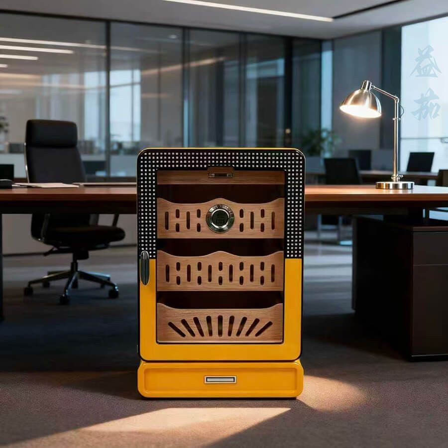 - Mặc dù hình ảnh hiển thị đồng hồ đo độ ẩm (ví dụ: 70%), các tủ phong cách này thường đi kèm với hệ thống làm mát bằng điện tử (thermoelectric) để duy trì nhiệt độ. Độ ẩm thường được kiểm soát bằng khay nước hoặc bộ tạo ẩm đi kèm.