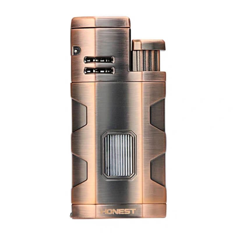 Chiếc bật lửa để bàn Honest đại 3 tia BCZ758 là mẫu bật lửa với ngọn lửa siêu mạnh mẽ. Thiết kế chắc chắn, đầm tay khi cầm nắm vô cùng tin cậy. Có thể sử dụng ở mọi góc độ mong muốn mà không làm sụt giảm sức mạnh ngọn lửa, chống gió trong nhiều trường hợp ngoài tự nhiên. Bản thân chiếc bật lửa BCZ758 được thiết kế tạo hình giống như một giá đỡ điếu Cigar khi đặt nằm trên mặt phẳng. Mặt trước được bổ sung thêm ô cửa trong suốt để quan sát lượng gas còn lại bên trong. Phần đáy ngoài lỗ bơm gas và núm chỉnh lửa còn được bổ sung thêm đục Cigar có thể mở ra gấp gọn vô cùng tiện dụng. Mẫu bật lửa này có thể được bơm đầy với hầu hết tất cả các loại bình gas có tại Deva Shop mà không cần sử dụng thêm bất kỳ đầu bơm nào.