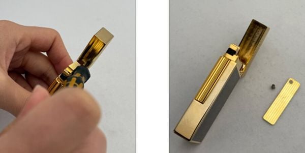 Mở nắp và tháo ốc: Sử dụng tua vít dẹt nhỏ để vặn ốc cố định lá mía cũ nằm bên trong nắp bật lửa.