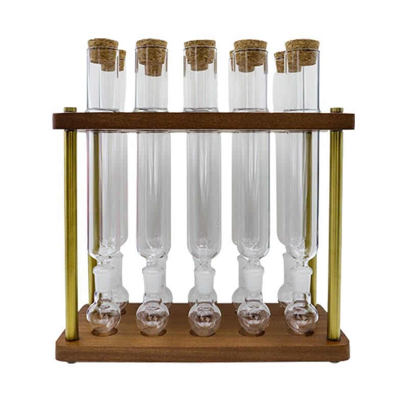 Đi cùng bộ sản phẩm là kệ gỗ kết hợp trụ kim loại, tạo nên phong cách phòng thí nghiệm độc đáo, đồng thời tăng tính thẩm mỹ khi trưng bày. Đây cũng chính là lý do bộ ống ủ cigar thường xuất hiện trong phòng cigar lounge, phòng làm việc hoặc không gian sưu tầm cao cấp.