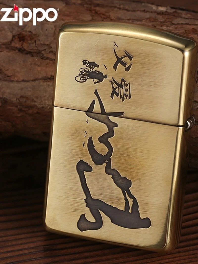- Vỏ Zippo: Dòng vỏ đồng vàng nguyên khối dày hơn 1.5 dòng tiêu chuẩn, đầu tròn, mộc đáy lồi. Bản lề 5 chấu.