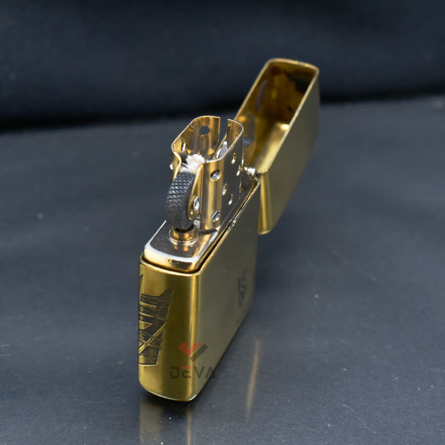 - Vỏ Zippo: Dòng vỏ đồng vàng nguyên khối dày hơn 1.5 dòng tiêu chuẩn, đầu tròn, mộc đáy lồi. Bản lề 5 chấu.