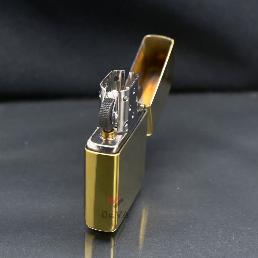 - Vỏ Zippo: Dòng vỏ đồng vàng nguyên khối dày hơn 1.5 dòng tiêu chuẩn, đầu tròn, mộc đáy lồi. Bản lề 5 chấu.