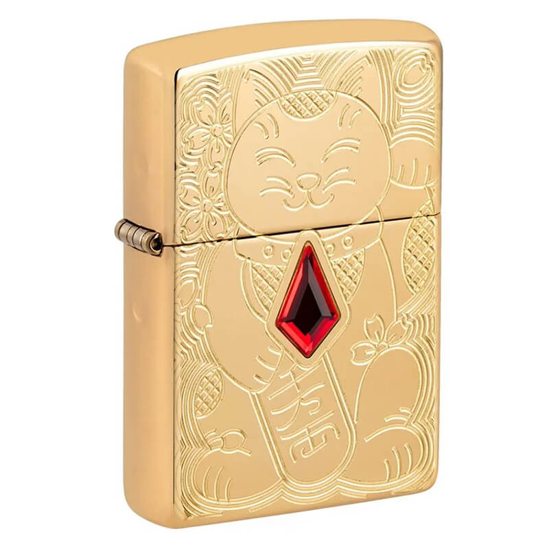 Bật Lửa Mỹ xuất Nhật Zippo Armor Khắc Hình Mèo Thần Tài May Mắn Maneki-Neko Khảm Đá Quý Lucky Cat Design Z133