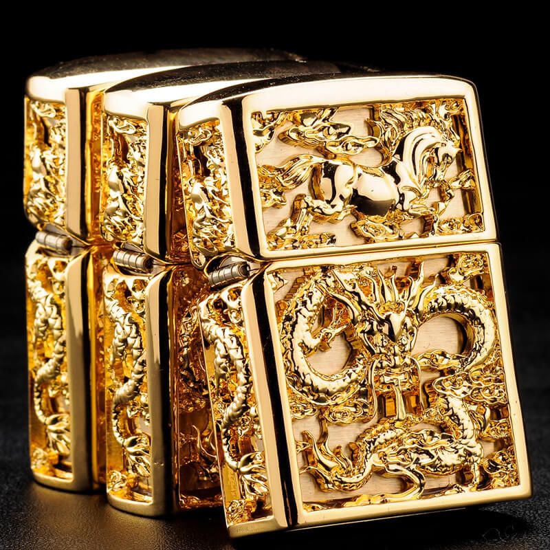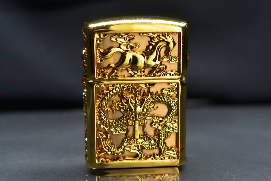 Anh em chơi bật lửa sẽ có thể sở hữu cả 2 hình tượng Long - Rồng và Mã - Ngựa chỉ tỏng một sản phẩm duy nhất là mẫu Zippo bọc vàng ZN382. Bao bọc bên ngoài bật lửa ZN382 là các bức phù điêu tạo hình Rồng và Ngựa cực kỳ đẹp mắt. Tất cả được khắc nổi bật tỉ mỉ tới từng chi tiết tạo nên những hình ảnh tinh xảo về hai loài vật này. Đây thực sự là một siêu phẩm dành cho anh em có đam mê sưu tầm!