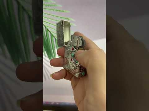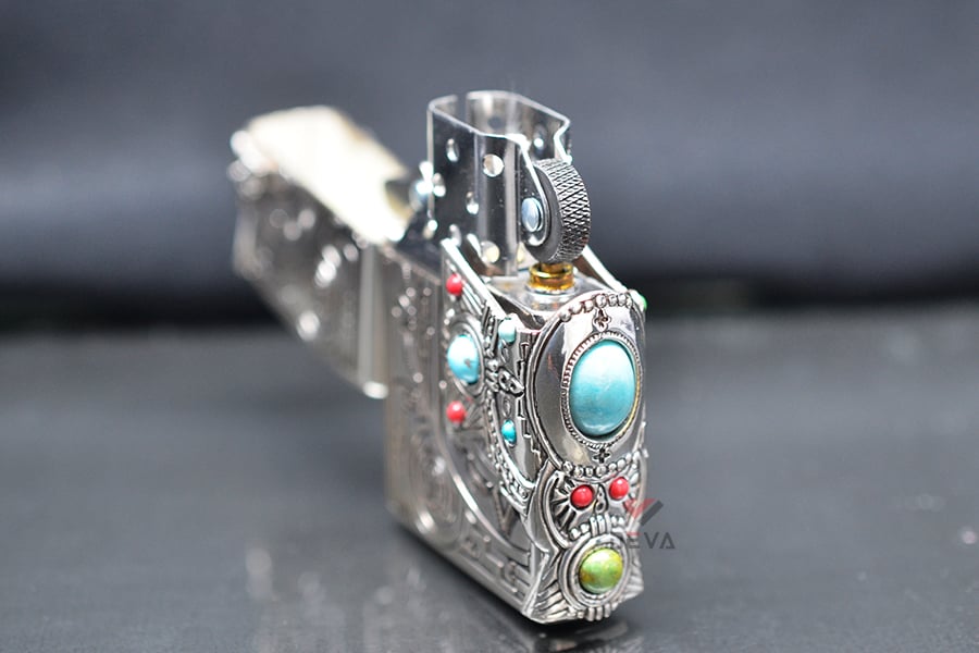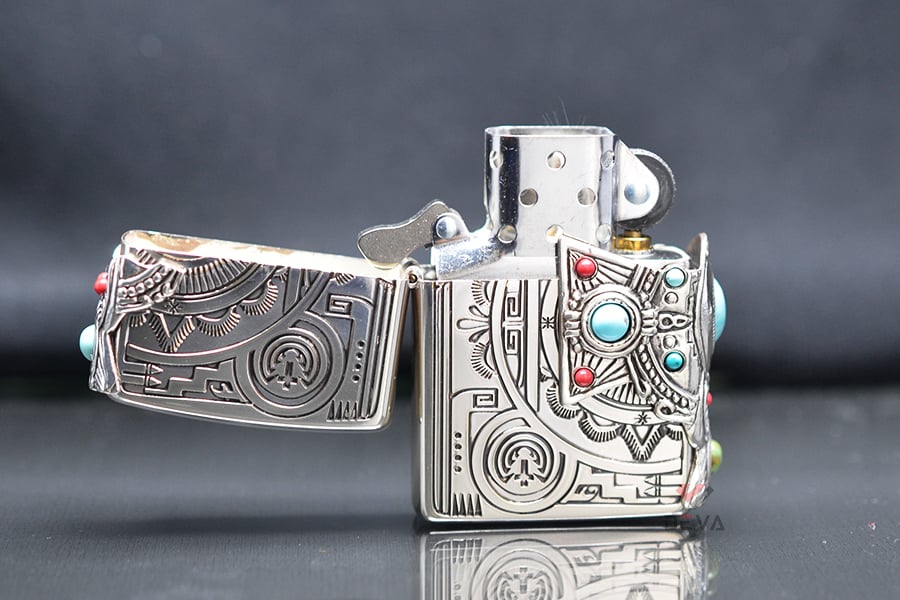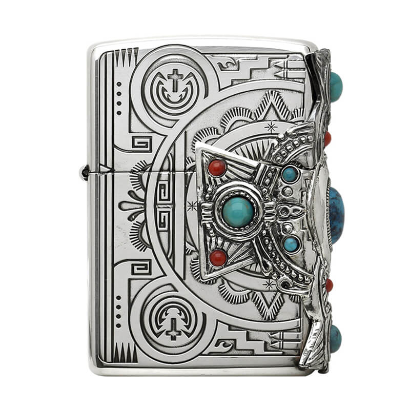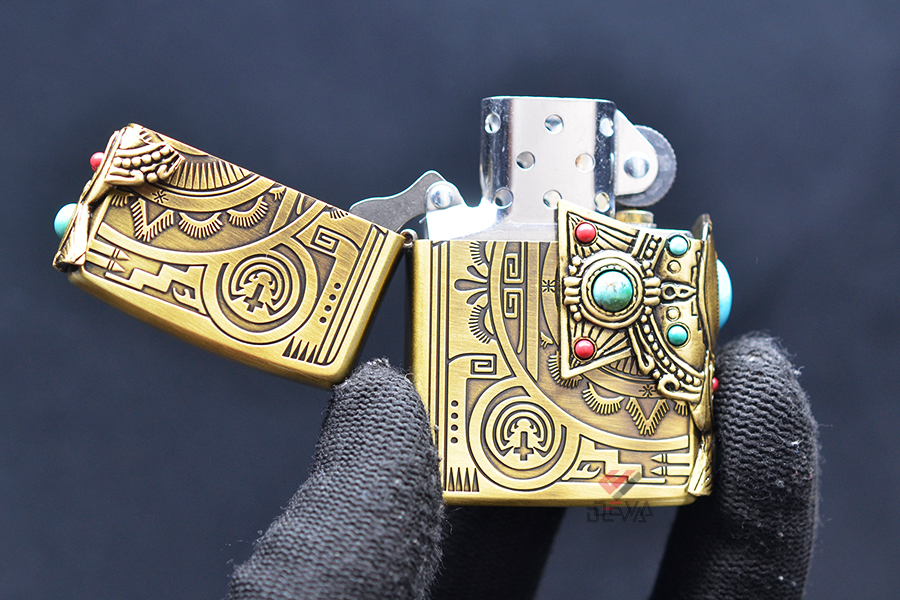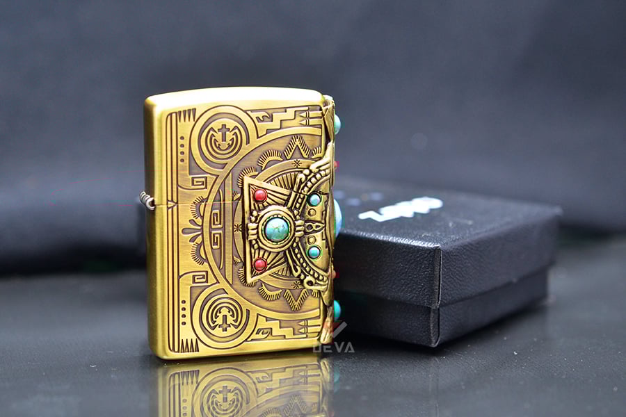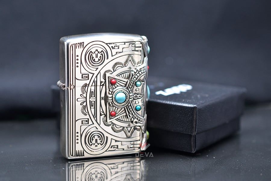 Bật Lửa Zippo Xuất Nhật Khắc Hoa Văn Totem Thần linh Anh Điêng Ốp Emblem Mã Não Xanh Ngọc ZN323:
