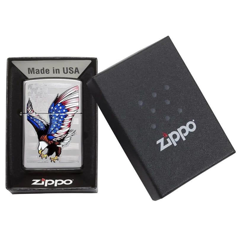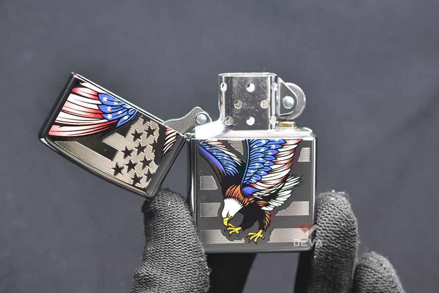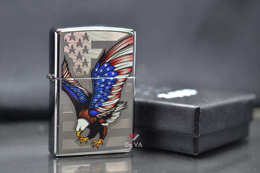 Mẫu Bật lửa Zippo này được mạ Chrome sáng bóng. Bề mặt trước dập nổi cách điệu lá cờ Mỹ. Bên trên được in hình màu biểu tượng chim Đại Bàng Đầu Trắng tượng trưng cho Tự Do và Độc Lập.