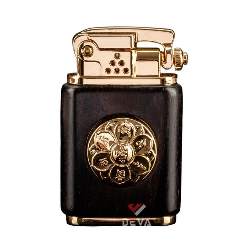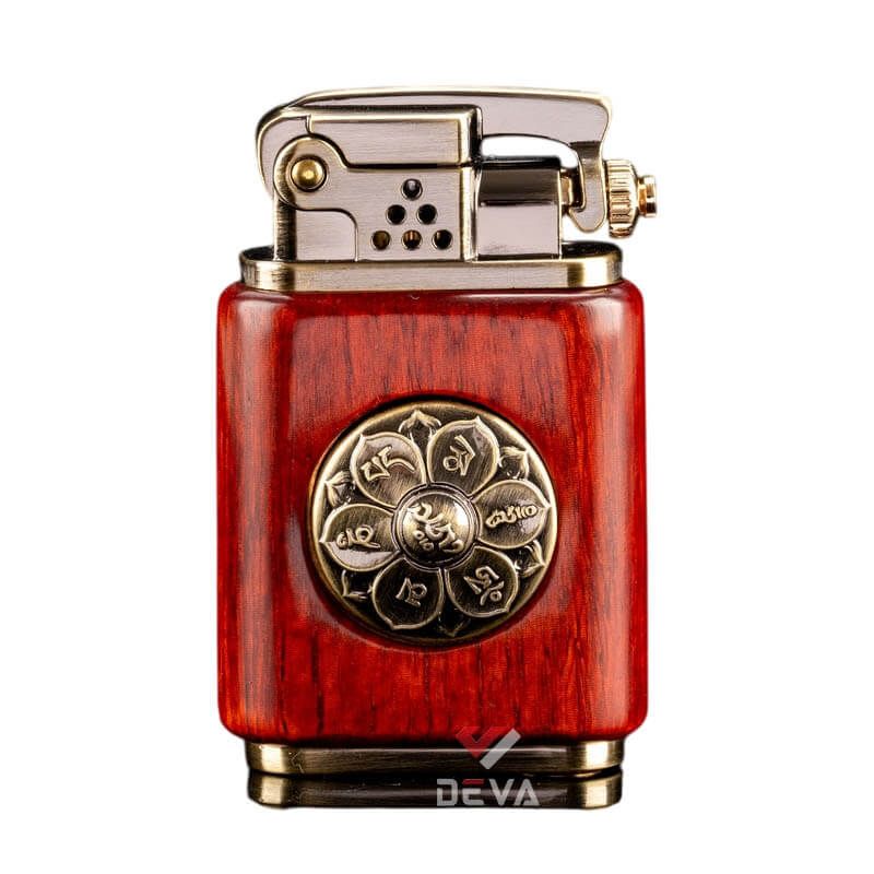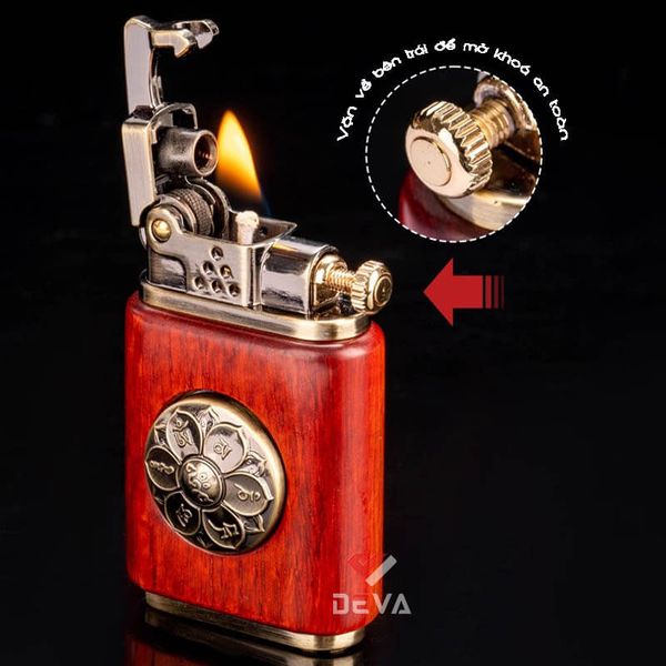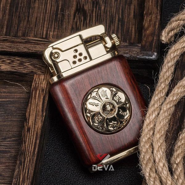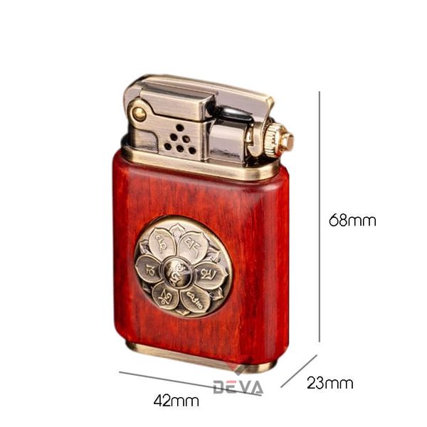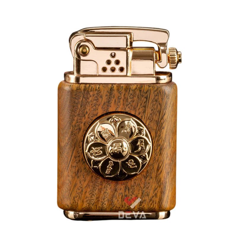 - Thiết kế Phong Thủy: Thân bật lửa được bọc gỗ tự nhiên (vân gỗ sang trọng) mang lại cảm giác cầm ấm áp và chắc chắn. Điểm nhấn đắt giá là vòng xoay Lục Tự Chân Ngôn (Om Mani Padme Hum) bằng đồng ở trung tâm, có thể xoay tròn như một chiếc kinh luân thu nhỏ, mang ý nghĩa cầu bình an và tài lộc cho gia chủ.