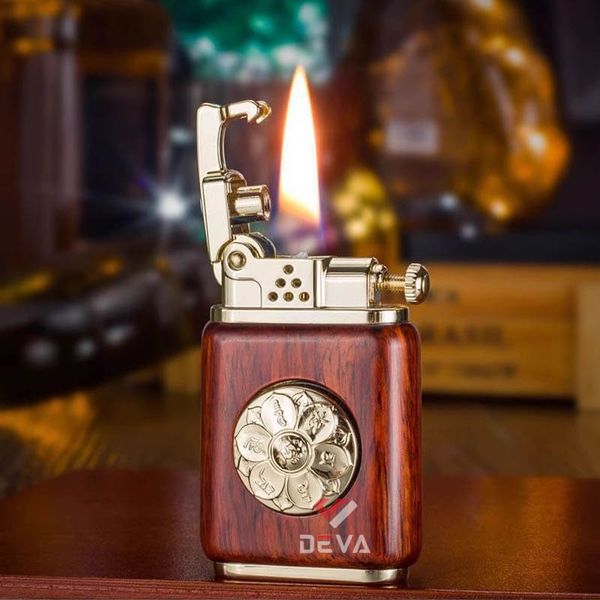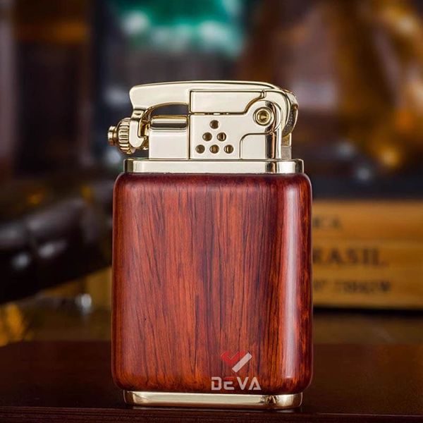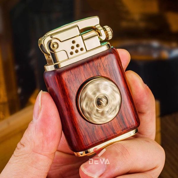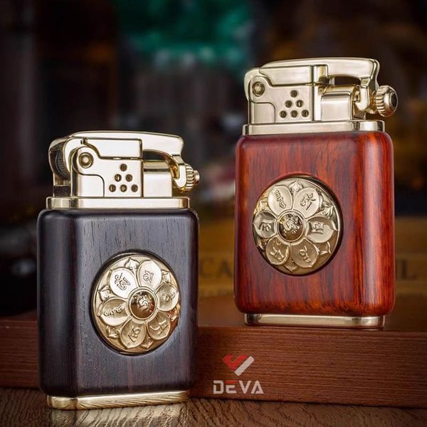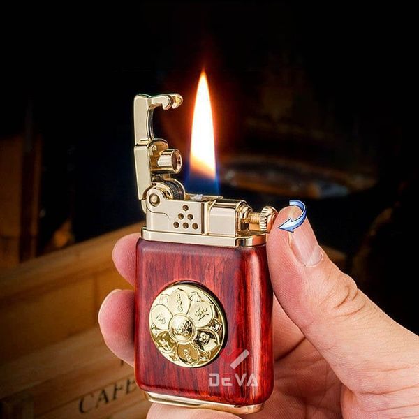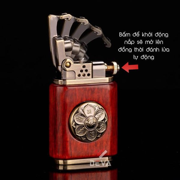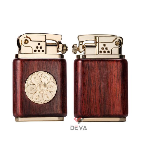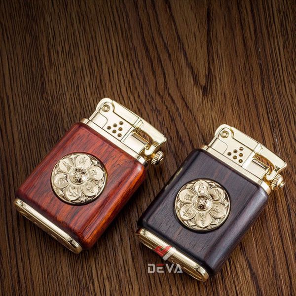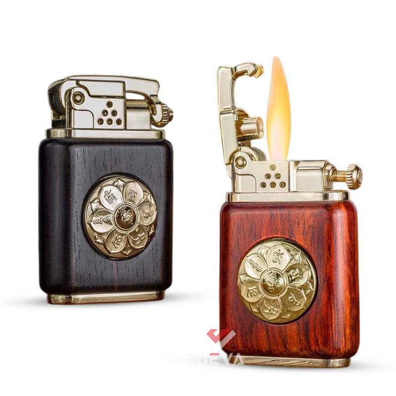 - Thiết kế Phong Thủy: Thân bật lửa được bọc gỗ tự nhiên (vân gỗ sang trọng) mang lại cảm giác cầm ấm áp và chắc chắn. Điểm nhấn đắt giá là vòng xoay Lục Tự Chân Ngôn (Om Mani Padme Hum) bằng đồng ở trung tâm, có thể xoay tròn như một chiếc kinh luân thu nhỏ, mang ý nghĩa cầu bình an và tài lộc cho gia chủ.